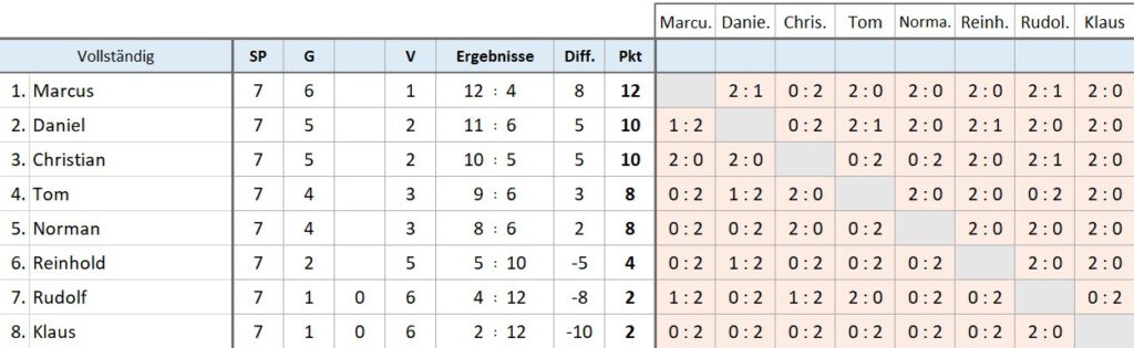 Am Ende setzte sich Marcus Keller mit 12 Punkten durch und sicherte sich den Turniersieg. Dahinter folgten DanielPenker und Christian Daxbergermit jeweils 10 Punkten. Auf den weiteren Plätzen landeten Tom Seemüller (8), Norman Rettel (8), Reinhold Wingert (4), Rudolf Scheufler (2) und Klaus Wegener (2).